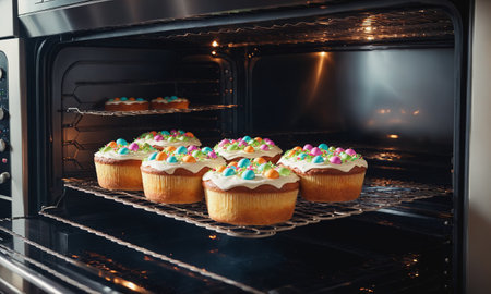 A batch of freshly baked cupcakes adorned with colorful icing and candies sits inside a modern oven.