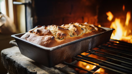 Freshly baked bread on kitchen table with sunlight and plants for a cozy morning ambiance. That the image is generated using AI.