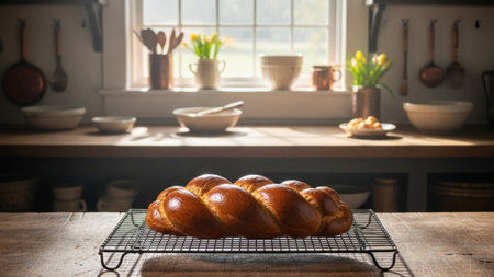 A cinematic, ultra-wide 16:9 photograph capturing a braided Easter bread loaf (Challah/Kozunak) cool