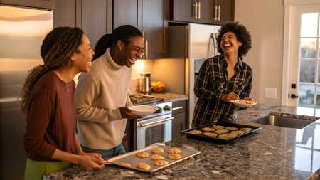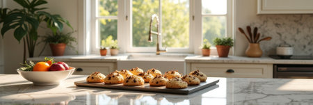 Sunny kitchen with freshly baked cookies on marble countertop by window. That the image is generated using AI.