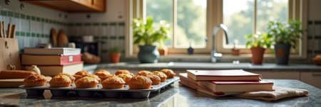 Cozy kitchen with freshly baked muffins and cookbooks on sunny countertop. That the image is generated using AI.