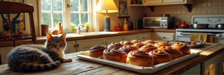 Cat relaxing in cozy kitchen with freshly baked cinnamon rolls on wooden table. That the image is generated using AI.