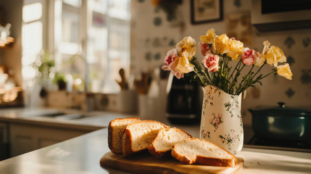 A serene kitchen scene featuring freshly sliced bread and a lovely floral arrangement in an elegant vase, illuminated by gentle morning light.