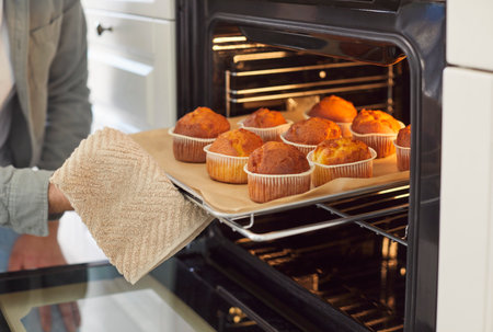 Homemade Pastry. Woman putting with cupcakes muffins to oven in kitchen, unrecognizable female wearing cooking mitten glove enjoying baking at home, cropped image, closeup shot with free space