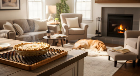 A freshly baked apple pie cools on a wire rack in a kitchen foreground, releasing steam into the air. The background reveals a cozy living room with a crackling fireplace and a golden retriever dog sleeping on a rug, evoking warmth and home comfort.