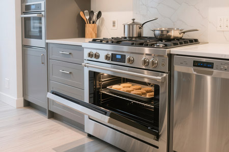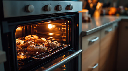 Freshly baked cookies wait in a modern oven, radiating warmth and an irresistible aroma, perfect for enhancing a cozy kitchen atmosphere.