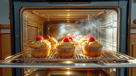 A delightful scene featuring freshly baked cupcakes adorned with raspberries inside an oven, releasing steam. Perfect for dessert lovers and baking enthusiasts.