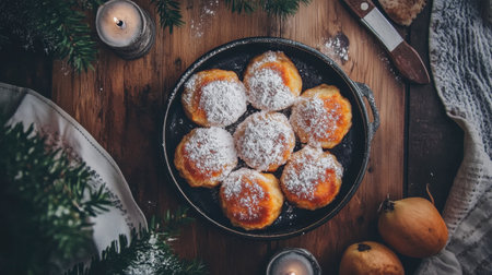 A beautifully arranged platter of baked treats dusted with powdered sugar, complemented by natural elements and warm candlelight, perfect for festive gatherings.