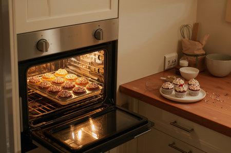 cupcakes being baked in a kitchen with the timer counting down, created with generative ai