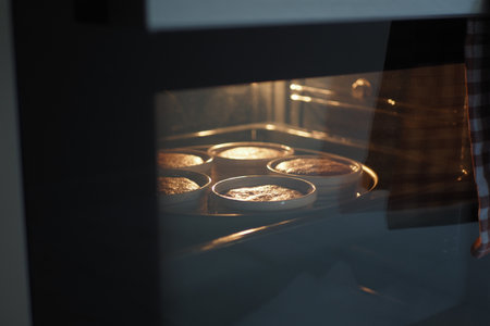 Modern oven with trays of muffins baking, viewed from the side in a kitchen
