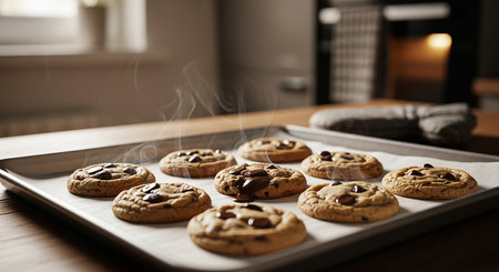 Enjoy the warmth of freshly baked cookies cooling on a tray in a cozy kitchen, releasing delicious steam. Perfect for food lovers and baking enthusiasts alike.