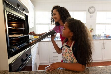 Side view of a mixed race woman in a kitchen with her young daughter at Christmas, looking into an oven