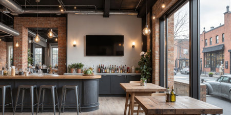 A loft-inspired restaurant interior with concrete walls, wooden flooring, and a sleek bar setup. A perfect blend of modern design