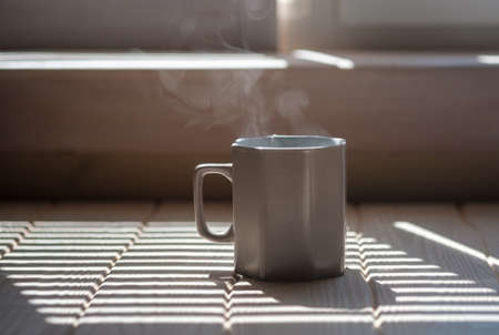 a mug of hot tea on a wooden table. shade from the window blinds in the morning. steam from a mug of tea