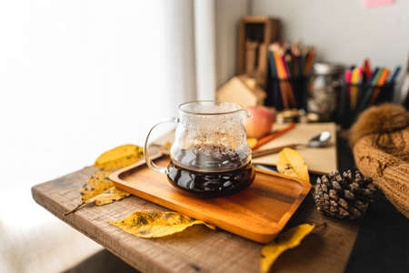 Coffee maker and coffee cup on wooden table in coffee shop