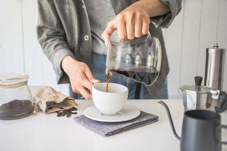 The professional of a barista poured water dripping hot coffee into the cup with equipment, tool brewing at kitchen home