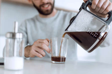 attractive man pouring himself a Cup of morning coffee