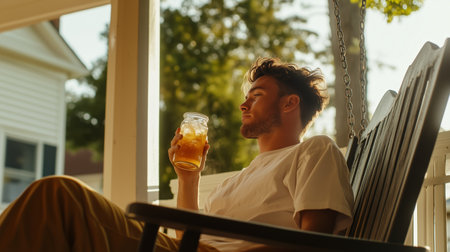 Man relaxing on a porch swing while enjoying a refreshing drink during golden hour in a serene outdoor setting