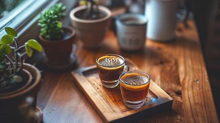 A warm and cozy cafe table setting with two cups of coffee, a wooden tray, and potted plants near a sunlit window, creating a relaxing atmosphere.