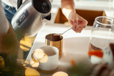 Woman is making hot tea in the kitchen.