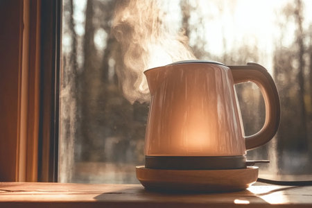 Soft morning light filters through a window, illuminating a kettle as steam rises gracefully.