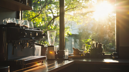 A cozy kitchen scene bathed in morning sunlight, featuring a coffee maker and blender. This inviting space highlights the connection between home and nature.