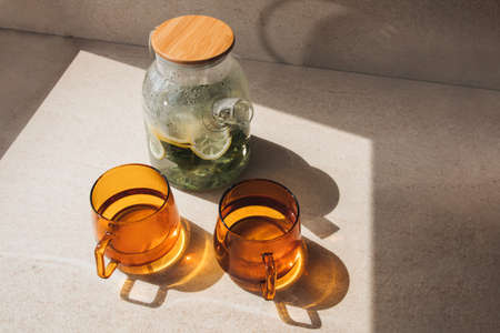 Mint tea with lemon in a glass teapot and two orange mugs on a stone background in the sunlight. Top view