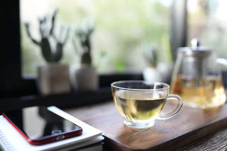 Tea in clear glass cup and teapot on wooden board with phone and notebook