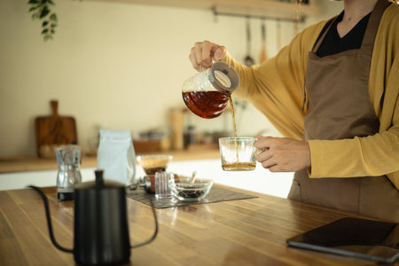 Close up of a woman in an apron pouring hot brewed coffee into a transparent glass mug.