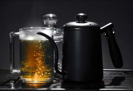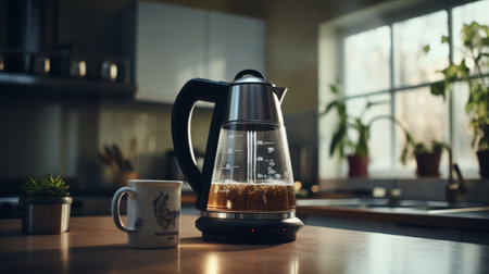 A coffee pot and a cup of tea on the table, AI
