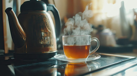 A traditional tea kettle on a stovetop, with a glass cup filled with steaming hot tea beside it, ready for a comforting tea session.
