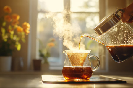 Hand Pouring Hot Coffee from Glass Server into Ceramic Mug on Sunny Morning