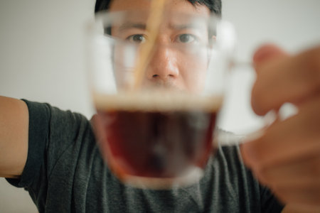 Out-of-focus hand of Thai man holding a cup of black coffee toward the camera in warm home light, reflecting relaxed hospitality, personal ritual, peaceful ambiance, and lifestyle gesture.