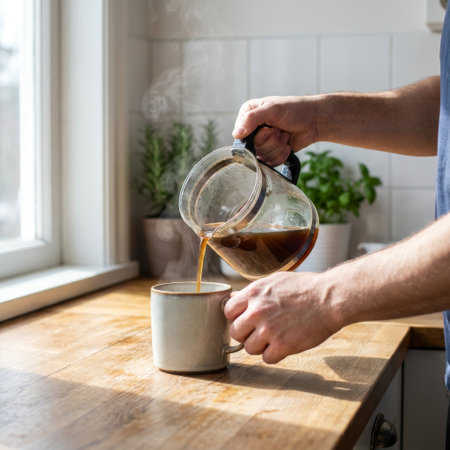 A man's hands pour steaming hot coffee from a glass pot into a rustic mug, a quiet morning ritual in a sunlit kitchen with a warm wooden countertop and fresh herbs.