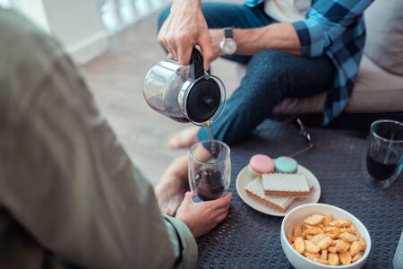 Coffee for woman. Caring loving husband pouring coffee for woman while eating breakfast