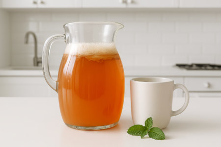 Glass pitcher of kombucha with mug on kitchen countertop next to fresh mint leaves. concept of healthy drink, refreshing beverage, home kitchen decor.