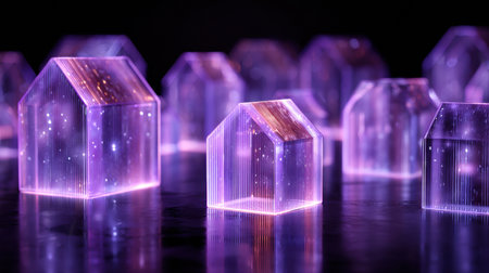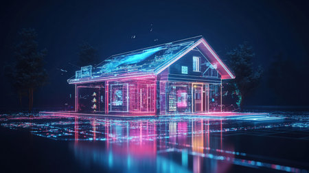 This vivid illustration showcases a futuristic blue home model illuminated with glowing lights, set against a digital grid background. The blend of architecture and technology creates a captivating concept for modern living.