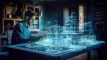 engineer works at home designing architecture plans with futuristic technology holographic. Architect working in blueprints whit digital innovative technology design. Generative Ai