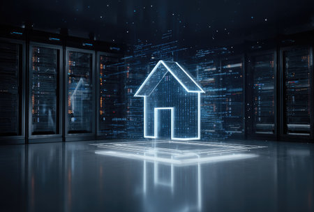A digital home icon glows brightly, set in a contemporary server room. The composition showcases a futuristic aesthetic with cool blue and white tones. The environment suggests advanced technology and data centers, appropriate for diverse commercial applications and creative projects.