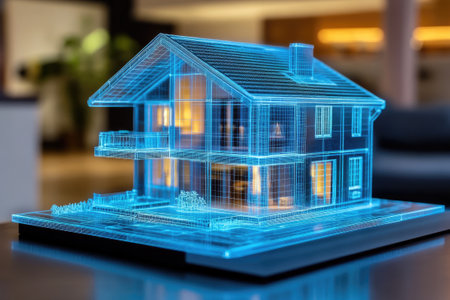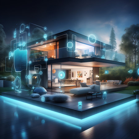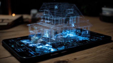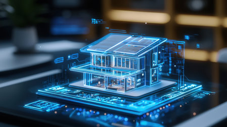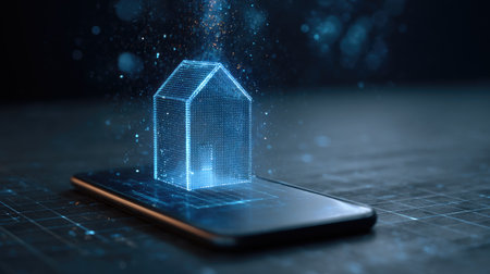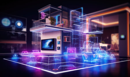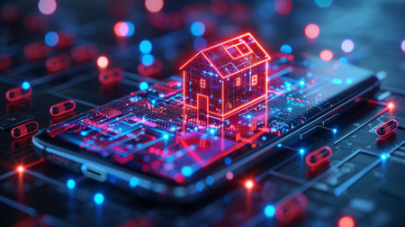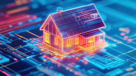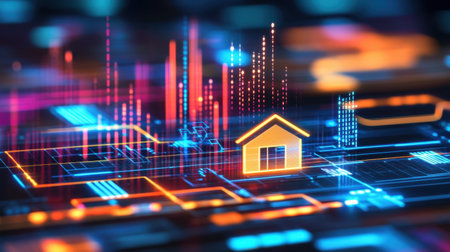 This image showcases a futuristic representation of smart home technology, featuring a digital interface with a house symbol, emphasizing innovation in home automation.