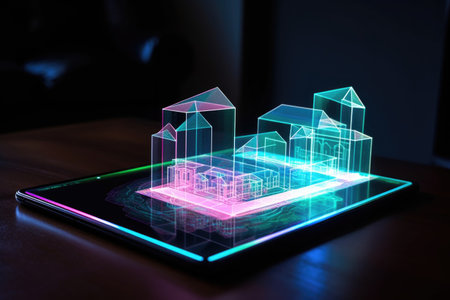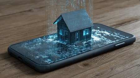 A modern smartphone displays a holographic house model, illustrating the intersection of technology and real estate through augmented reality.