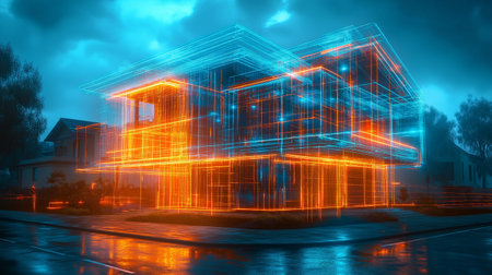 Explore a stunning digital depiction of a contemporary house showcasing holographic technology and innovative home features, perfect for modern living environments.
