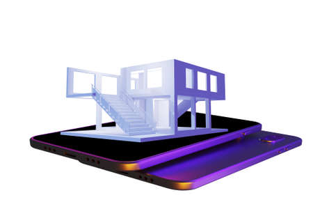 House mock-up on smartphone screen. Building design. Construction projects. Ads for the sale, purchase, rental of houses in gadget. Real estate concept. Buying home through apps. Collage on white. 3d