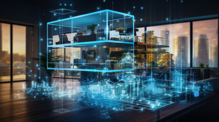 Virtual holographic 3d blueprints of real estate project displayed on table in modern office setting