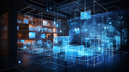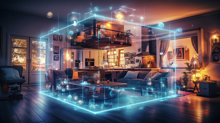 A concept art of a digital holographic artificial intelligence (ai) smart technology in a house and a flat. modern living room w virtual reality interface.by Generative AI
