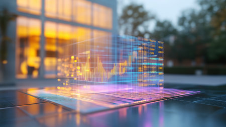 A futuristic holographic representation of financial market trends, showcasing dynamic graphs and data visualizations for advanced analytical insights in business and investment.