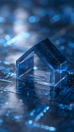 A crystal model of a house sits on a blue motherboard, conveying concepts of smart home technology, network infrastructure, and innovative design with interconnectedness.