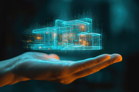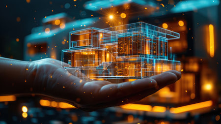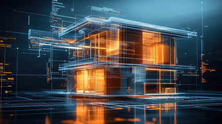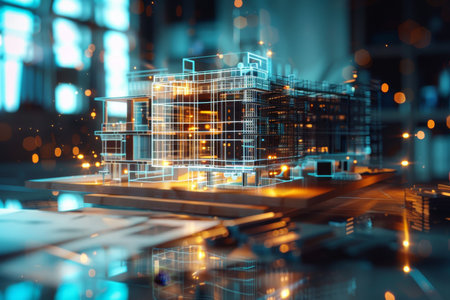 A luminous 3D wireframe model of a modern building materializes on a sleek glass interface, representing the intersection of architectural vision and futuristic technology.