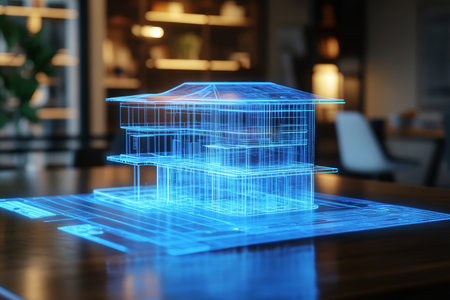 A futuristic interior presents a hologram of a modern building design. Bright blue light highlights the structure, revealing intricate details in a digital space.