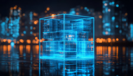 Illuminated glass cube building model with blue neon lights and reflected water on dark background